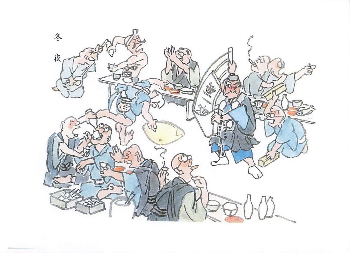 本日12月22日は冬至です。臨済宗の専門道場(修行の場)では、冬至の夜は冬夜(とうや)と言い、禅堂の本尊さまである聖僧(しょうそう)さま、つまり僧形の文殊菩薩像に目隠しをし、お酒を飲んで無礼講の大騒ぎをいたします。『雲水日記』という、昭和も初期のころの修行生活を絵日記風にまとめた本は、臨済宗のお坊さんが修行に行く前には情報収集のために、そして行った後には懐かしがって読む、とても有名な著作ですが、その中にも冬至冬夜の大騒ぎが記されています。