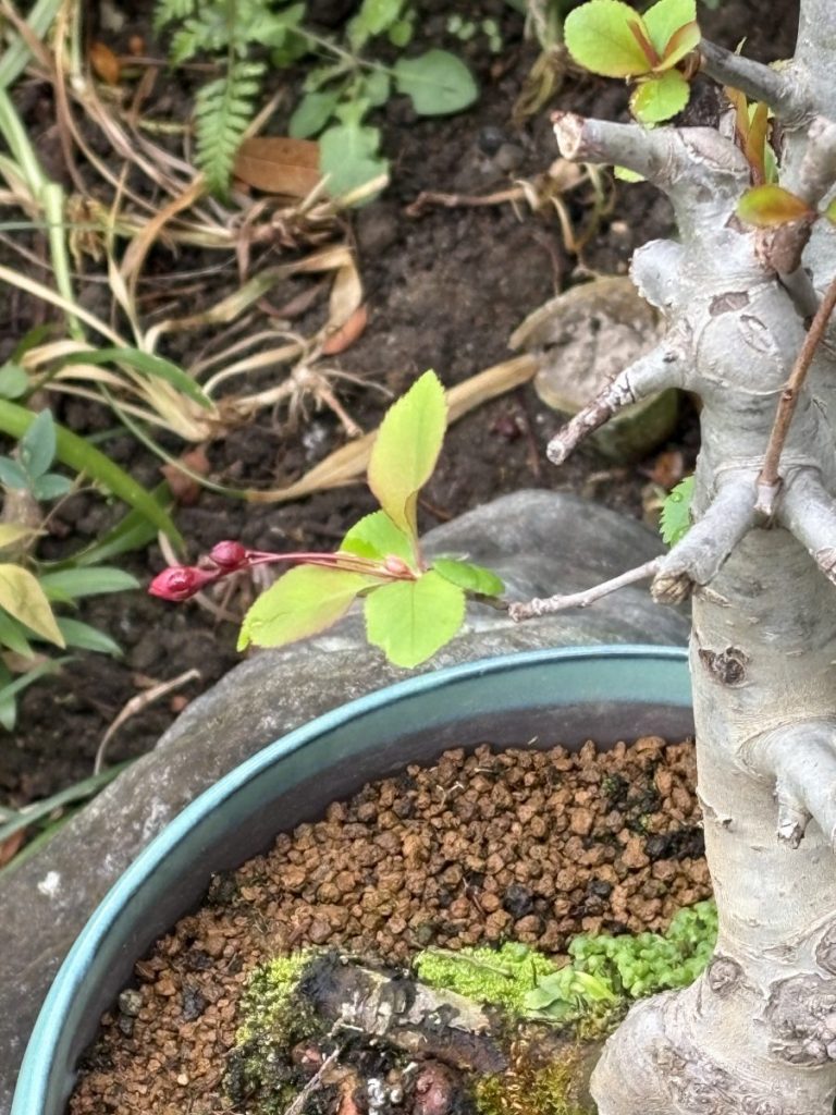 一昨年買った花海棠の鉢植えも、去年はあまり花が咲きませんでしたが、今年は期待したいです。ようやく一輪、つぼみが出てまいりました。